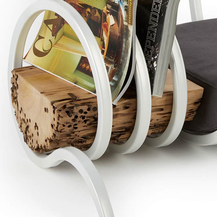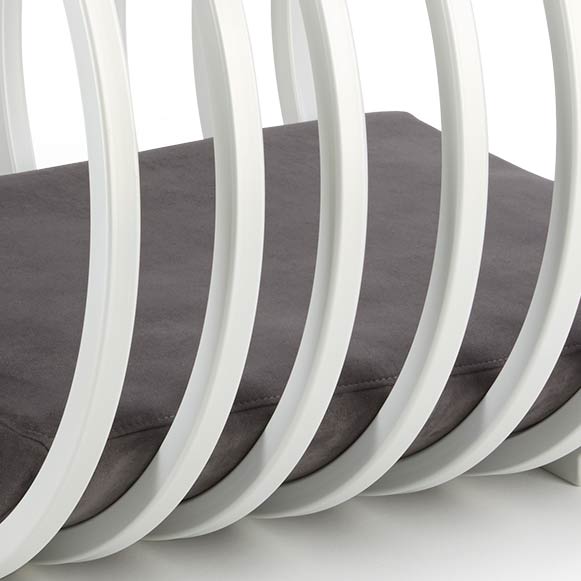 This minimalist circular bed is designed using square steel tubing. This design helps create a comfortable sleeping space with removable stain-resistant microfiber padding. Equipped with a wooden insert used in the Venetian lagoons, which will act as a magazine rack.