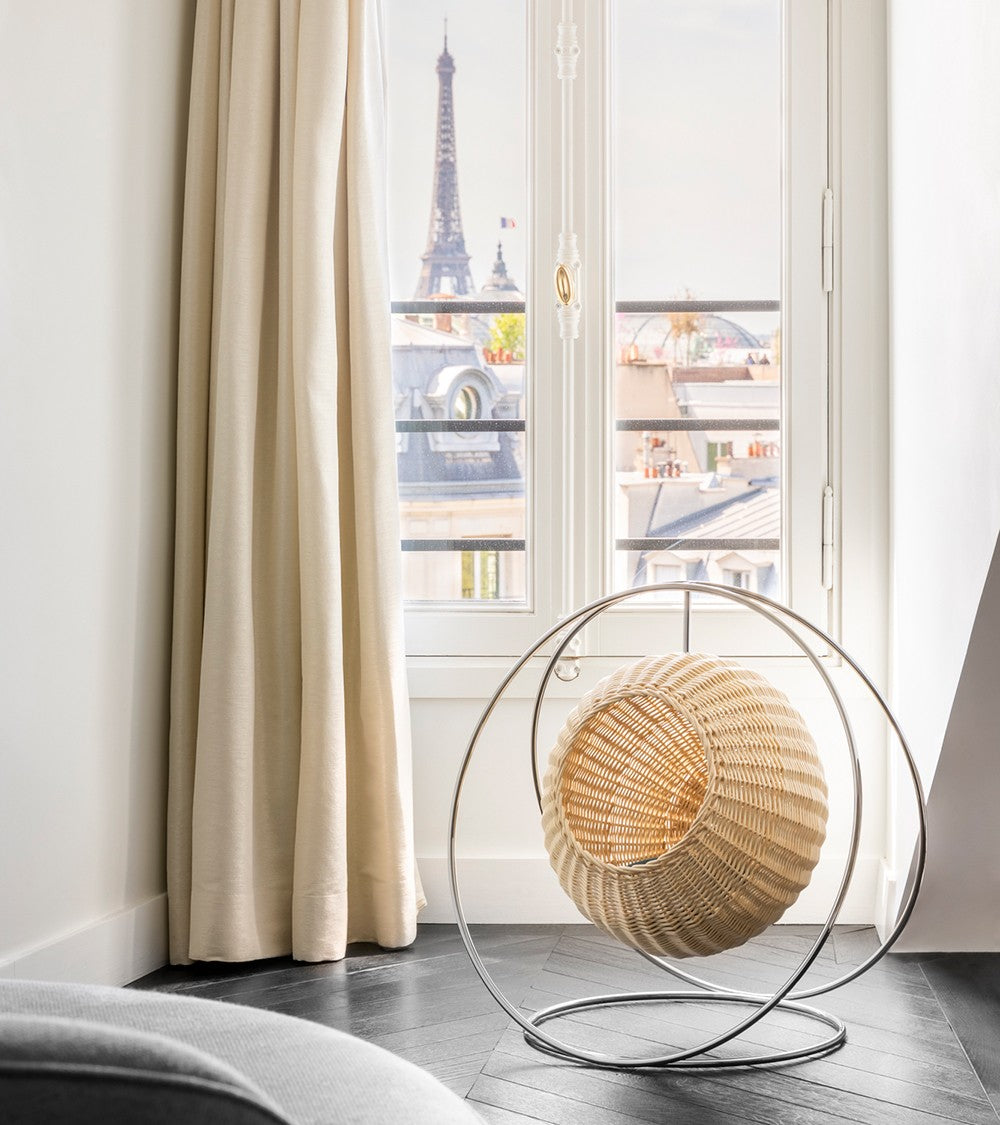 Le lit pour chat Solar combine élégance et artisanat avec une sphère en osier blanc, tressée à la main en France, et une structure en acier chromé fabriquée en Italie. Ce meuble raffiné allie matériaux 100 % européens et recyclables pour offrir à votre chat un espace de repos luxueux et éco-responsable.