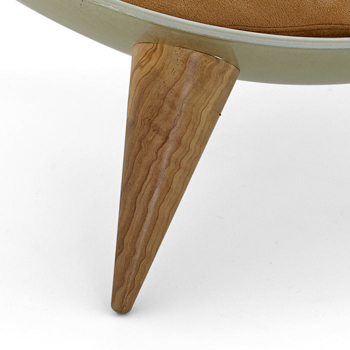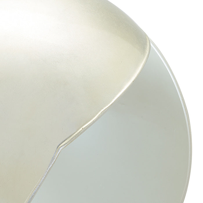 Cet élément design est composé de deux demi-sphères en acier habilement assemblées de manière irrégulière pour offrir un accès pratique. Il est orné de feuilles d'or appliquées à la main avec une technique spéciale, et repose sur des pieds en bois tournés à la main.