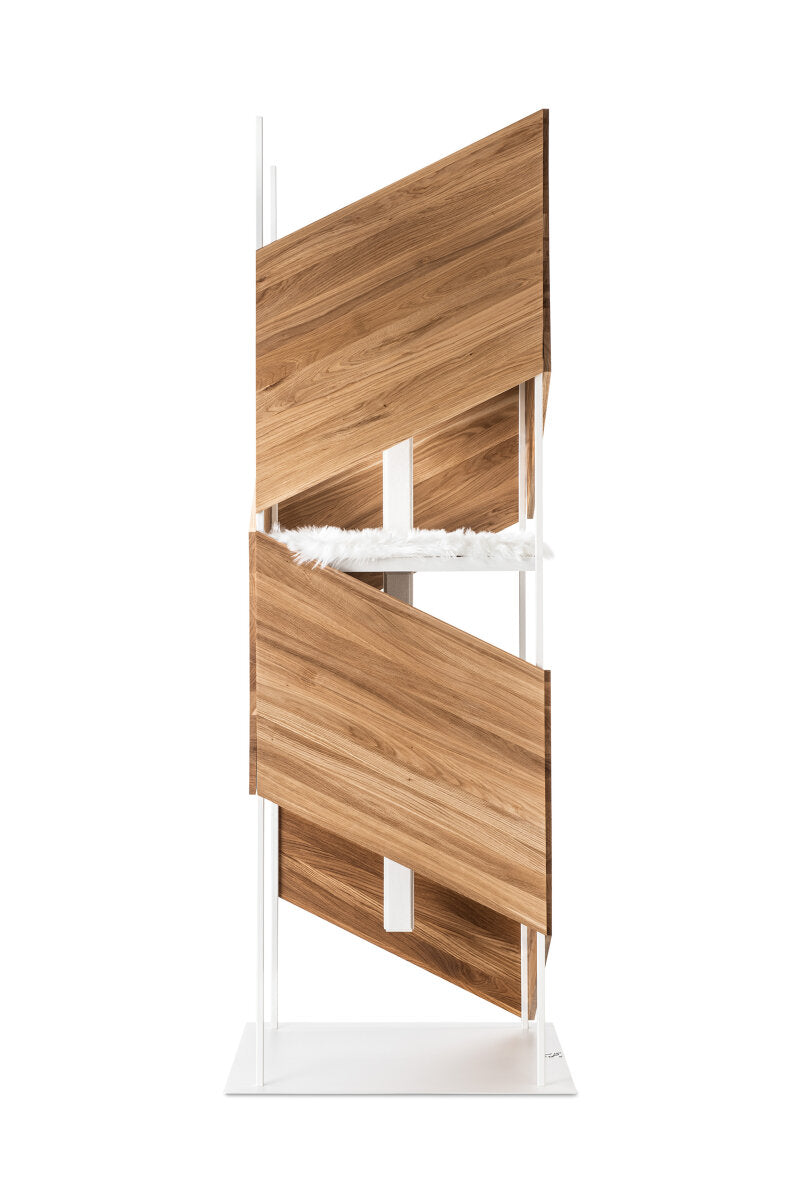 Un arbre à chat design et moderne fabriqué avec soin en chêne massif et en métal. Imaginé et créé par des designers pour répondre aux besoins des chats et pour ajouter une touche d'élégance et de style à votre environnement.