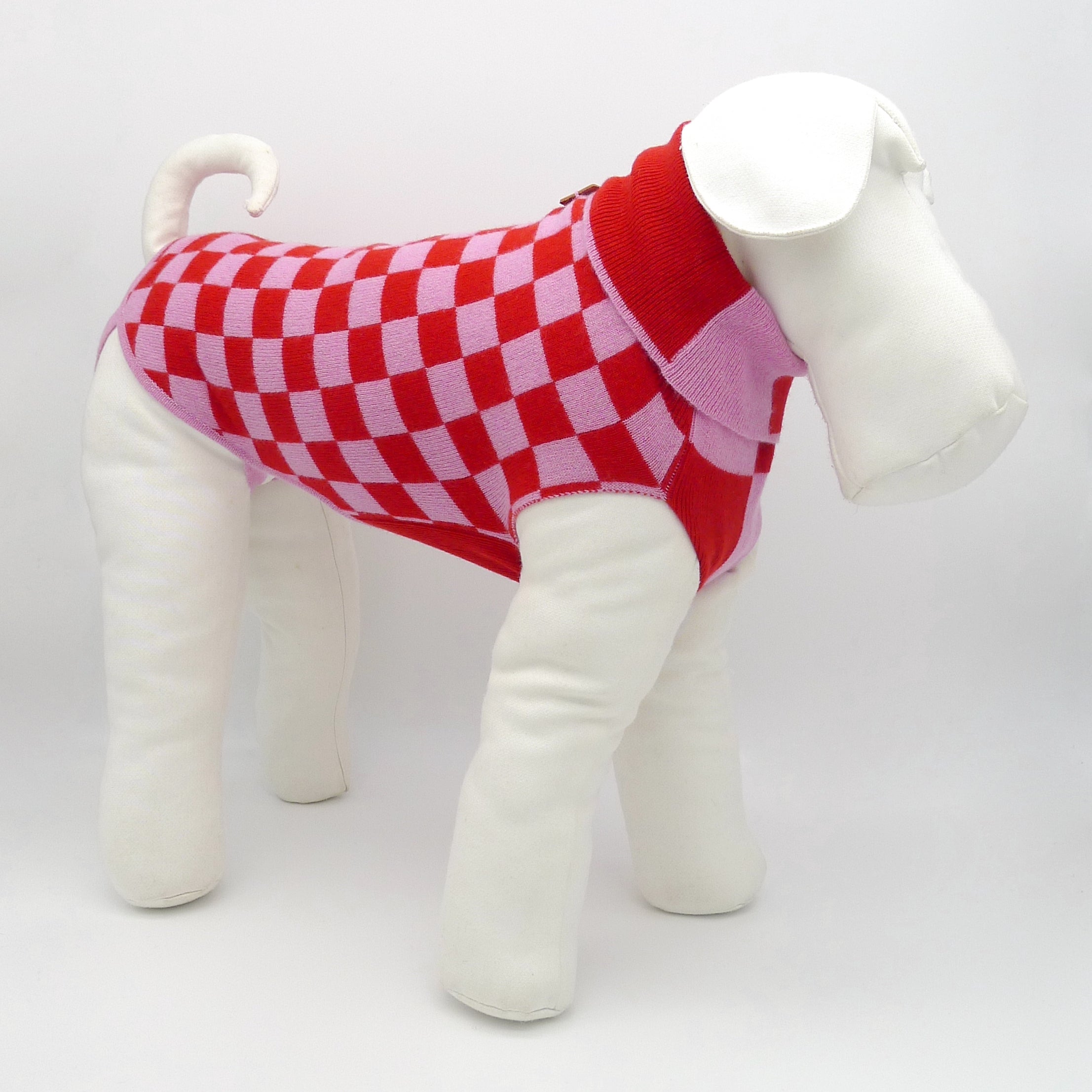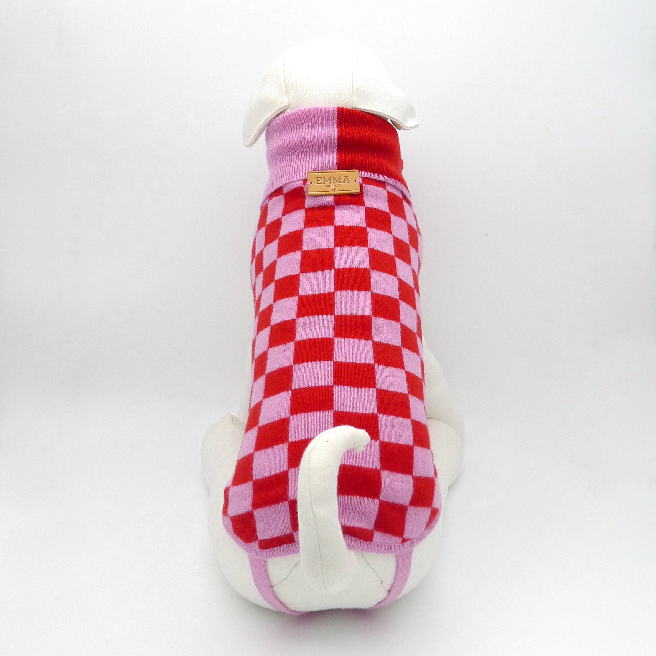 Un pull chaud et léger qui convient aussi bien aux saisons intermédiaires qu'aux saisons les plus froides, assurant un confort parfait à notre ami dans toutes les situations climatiques. Pull pour chien sur mesure en cachemire et laine merinos avec motif Damier en maille jacquard bleu clair et bleu marine.