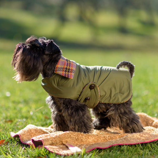 Veste en cachemire et laine avec motif à carreaux d'un côté et tissu imperméable vert olive de l'autre. Sans frais supplémentaires, vous pouvez demander une personnalisation : le nom de votre chien brodé sur le col avec le tissu inversé