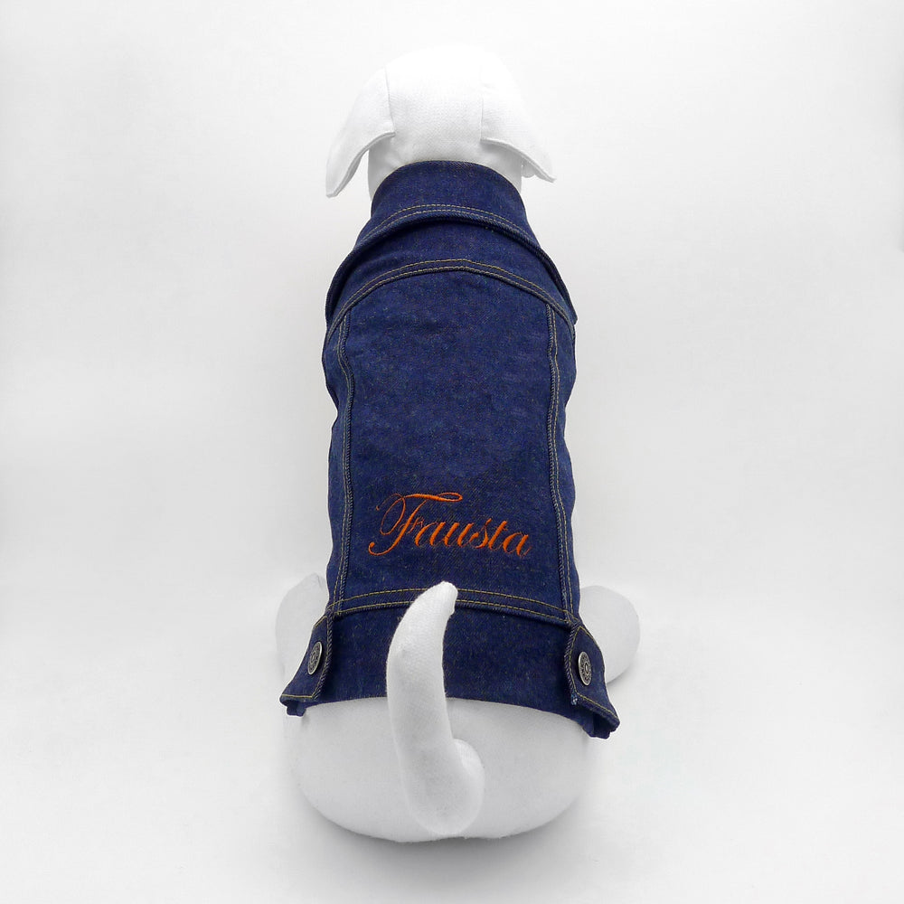 Veste pour chien sur mesure en denim de coton classique et sportif dans la couleur bleue indigo traditionnelle, avec un design qui respecte la version originale, des coutures aux boutons métalliques d'origine. Un vêtement né en 1880, lorsque M. Strauss a conçu la première veste en jean